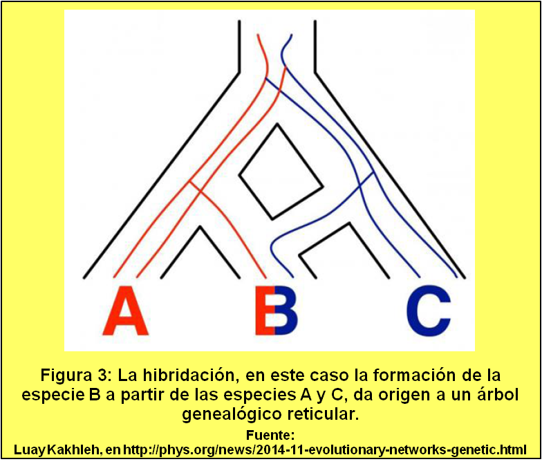 A la hora de elaborar un árbol genealógico de las especies, la hibridación causa complicaciones. Un ejemplo de un árbol en el que aparece una especie híbrida se muestra en la figura 3, en la que la especie “B” se originó de dos especies ancestrales, no de una sola. Como se puede apreciar, eso ya no se parece mucho a un árbol; más bien, se parece a una red. Por lo tanto, la historia evolutiva de organismos híbridos se denomina reticular.