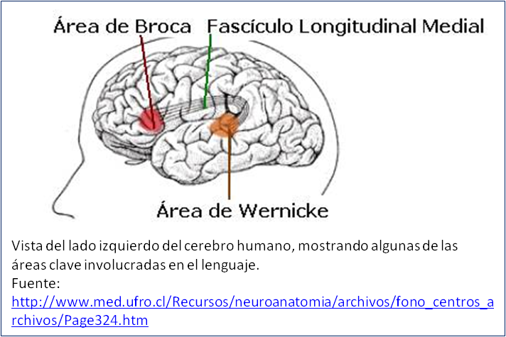Otras estructuras cerebrales relacionadas al habla, sin embargo, sólo se han identificado en los humanos. El área de Broca, por ejemplo, es un área ubicada en la parte frontal del cerebro humano, generalmente en el hemisferio izquierdo (ver figura), cuyo buen funcionamiento es esencial para que el individuo pueda hablar o escribir. En los demás primates no se ha encontrado esta área de Broca, sólo un área homóloga (o sea parecida, o precursora), que en el caso de los macacos está relacionada con la musculatura de la boca y cara[21] pero que se activa cuando el individuo está escuchando vocalizaciones emitidas por otros macacos[22], y en el de los chimpancés se activa cuando el chimpancé se está comunicando con otros[23].