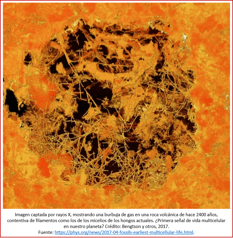 [xliii] Bengtson, S., Rasmussen, B., Ivarsson, M., Muhling, J., Broman, C., Marone, F., Stampanoni, M. y Bekker, A., 2017. Fungus-like mycelial fossils in 2.4-billion-year-old vesicular basalt. Nature Ecology & Evolution, 1, 0141. www.nature.com/articles/s41559-017-0141.