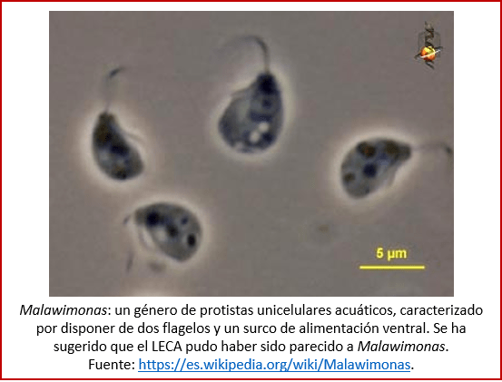 El último ancestro común de todos los eucariontes actuales se denomina LECA (last eucaryotic common ancestor). Es el organismo del que descendieron todos los eucariontes que habitan hoy en día nuestro planeta (ver imagen). Es en gran medida hipotético, ya que no tenemos ninguna información directa acerca del LECA, pero se ha podido obtener una idea acerca de cómo era a partir de reconstrucciones filogenómicas (o sea, del árbol genealógico) de organismos actuales y fósiles. Así se pudo determinar que el LECA era capaz de moverse [xxvi], y que perteneció a un grupo de organismos unicelulares acuáticos que tienen dos flagelos (similares al látigo que hoy en día todavía tienen los espermatozoides) para propulsarse en el agua, parecido al actual Malawimonas (ver imagen, abajo) [xxvii].