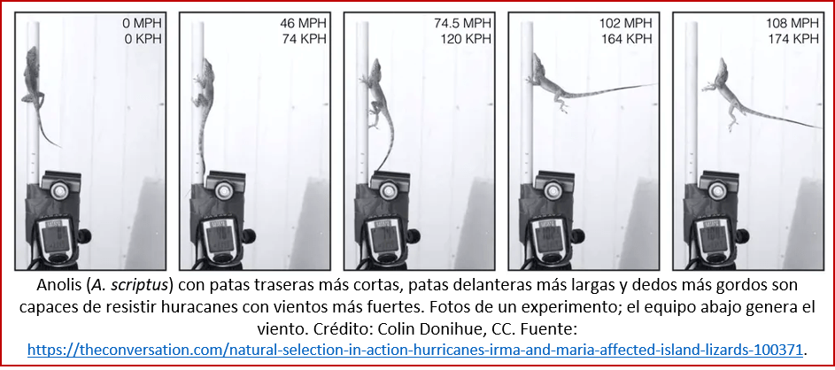 En el verano de 2017, dos huracanes, Irma y María, asolaron las islas Turcas y Caicos en el Caribe. Tuvieron un impacto fuerte sobre las poblaciones de lagartos, específicamente el anolis A. scriptus, que vive casi exclusivamente en estas islas (ver imagen). Una comparativa de las formas y dimensiones de los individuos de este anolis, antes y después de los huracanes, mostró que los ejemplares que sobrevivieron tenían una fisionomía distinta de lo normal: sus dedos eran más gruesos y sus patas delanteras eran más largas, lo que les permitía agarrarse mejor a las ramas de las matas y arbustos, y así evitar ser arrastrados por los vientos de los huracanes. Las patas traseras, por otro lado, eran más cortas, lo que – según se pudo confirmar mediante experimentos – limitaba la exposición del cuerpo al viento (ver imagen). Si estos cambios fisiológicos persisten a lo largo de las generaciones venideras, se puede afirmar que los huracanes causaron una evolución de A. scriptus, al forzar una mejor adaptación a los huracanes [xv].