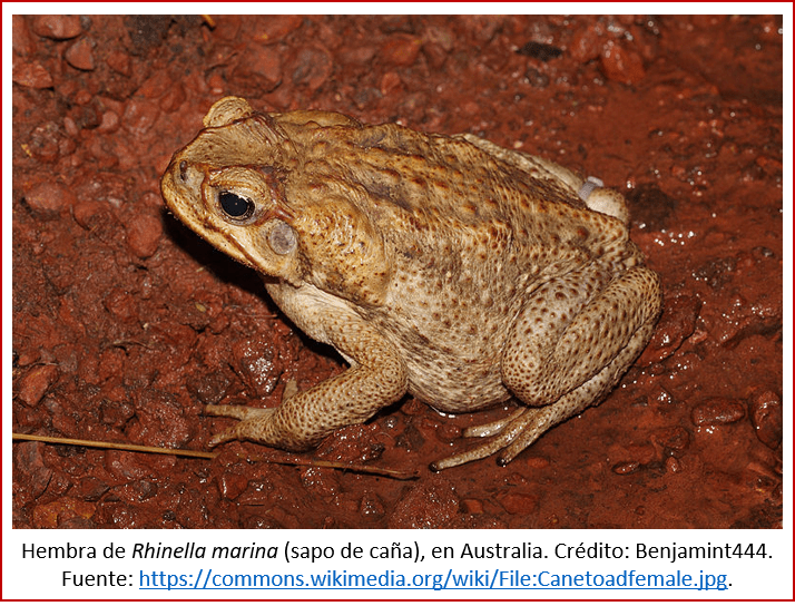 Los sapos, por su parte, también nos enseñan cosas interesantes acerca de la evolución. El sapo Rhinella marina (sapo de caña; ver imagen), por ejemplo, es una especie invasora en Australia donde llegó hace 75 años, llevada por el hombre [xxiv]. Por falta de depredadores su área de distribución en Australia se está ampliando, a un ritmo cada año mayor.