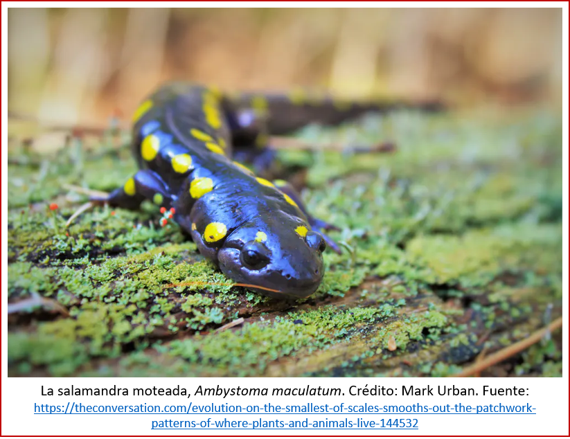 La presencia de depredadores puede causar respuestas distintas de un lugar a otro, que además pueden afectar a múltiples porciones de los ecosistemas. Volviendo a las salamandras: en ciertos lagos del este de Norteamérica viven dos especies de salamandra: la salamandra moteada y la veteada. La salamandra veteada (Ambystoma opacum) es la más grande, y depredador: se come, entre otras cosas, ejemplares juveniles de la salamandra moteada (A. maculatum; ver imagen). Por lo tanto, la salamandra moteada es escasa en muchos lagos, y tiene una estrategia de comer muchos insectos y de reproducirse rápidamente. Pero en algunos lagos, esta salamandra sí es común: ha logrado ganarle a la salamandra depredadora. Esto lo logró mediante una adaptación pequeña pero relevante: come más, de manera que crece más rápidamente y alcanza un tamaño mayor, tan grande que la salamandra depredadora, cuya boca tiene una apertura limitada, ya no la puede comer. Esta adaptación no sólo ayudó la salamandra moteada a prosperar, sino que cambió el ecosistema: para crecer más, esta salamandra se nutre de grandes cantidades de los pequeños crustáceos que viven en los lagos, haciéndole competición a la salamandra depredadora (lo que implica riesgos, pero trae un beneficio importante). Por lo tanto, la población de crustáceos es más pequeña en aquellos lagos donde prosperan las salamandras moteadas, y cambió el ecosistema. De esta manera, la presencia de depredadores puede causar cambios adaptativos en las presas, que a su vez pueden dar origen a cambios en todo el ecosistema [viii].