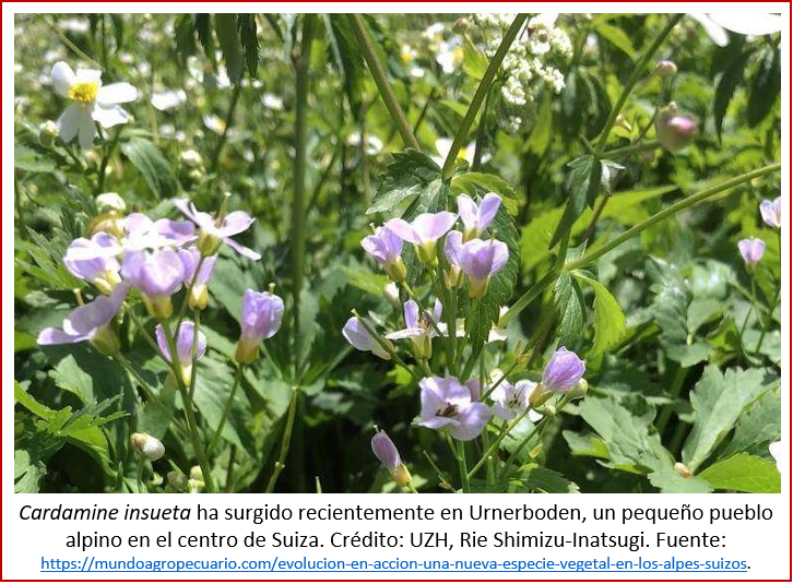 [24] Sun, J., Shimizu-Inatsugi, R., Hofhuis, H., Shimizu, K., Hay, A., Shimizu, K.K. y Sese, J., 2020. A recently formed triploid Cardamine insueta inherits leaf vivipary and submergence tolerance traits of parents. Frontiers in Genetics, 11, 567262. https://doi.org/10.3389/fgene.2020.567262. Ver también: https://mundoagropecuario.com/evolucion-en-accion-una-nueva-especie-vegetal-en-los-alpes-suizos.
