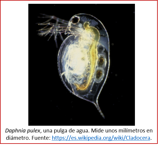 Son muchos los animales pequeños que nos enseñan cómo funciona la evolución. Las pulgas de agua de la especie Daphnia, por ejemplo, que a pesar de su nombre informal son pequeños crustáceos de agua dulce (ver imagen abajo), fueron el objeto de un estudio reciente acerca de la evolución en acción. En lagos del Wisconsin (Estados Unidos), las Daphnia han tenido que encarar la aparición de un nuevo depredador (otra especie de pulga de agua) en el pasado reciente; lo hicieron mediante cambios en conducta y en su historia de vida. Se tomaron muestras de sedimento en el fondo de algunos de estos lagos, con edades distintas: correspondientes a intervalos justo antes, durante, y después de la aparición del depredador. En las muestras había huevos de Daphnia, que pudieron ser resucitados, dando origen a ejemplares vivos, pero de distintos momentos en el tiempo. Estos ejemplares se estudiaron genéticamente.