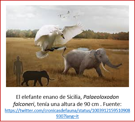 Volviendo a los mamíferos, un caso distinto se ha dado en ciertas islas, por ejemplo en el Mediterráneo, donde se ha observado una reducción del tamaño de varios grupos de mamíferos, lo que se denomina el “enanismo insular”. Hasta hace unos 4500 años, hubo elefantes (ver imagen) y otros mamíferos miniaturizados en la isla de Sicilia. En otras islas se encontraron los restos de pequeños hipopótamos y caballos. Este fenómeno (algunos lo llaman una regla, pero tiene unas cuantas excepciones) se dio, en el caso de los herbívoros medianos y grandes, en islas donde había poca presión de depredadores y poca competencia por los alimentos. También entre los antecesores de nuestra especie puede haber habido casos de enanismo: Homo floresiensis, un congénere nuestro miniaturizado de la isla de Flores (Indonesia; ver imagen abajo), puede deber su tamaño reducido a esta misma causa [19].