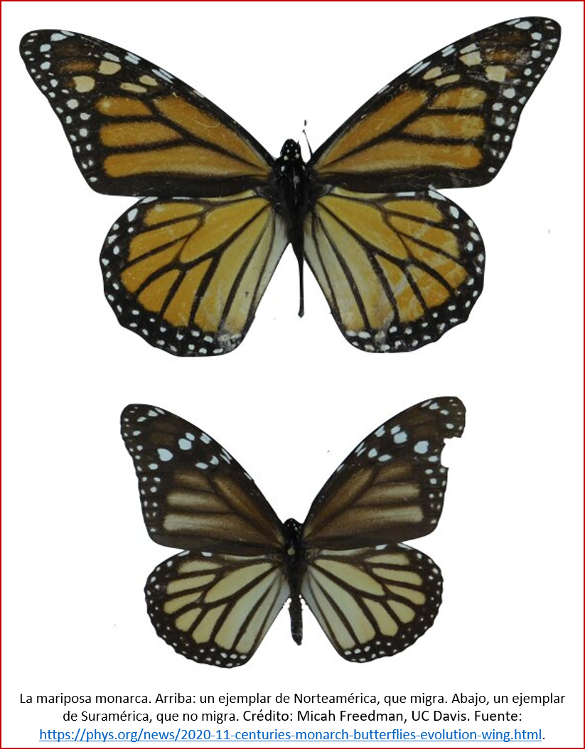 Pero también hay otros ejemplos, entre los que se encuentra una de las mariposas más famosas: la monarca (ver imagen). La mariposa monarca vive principalmente en Norteamérica, donde es famosa por su larga migración anual: desde Canadá a México, y de vuelta [12]. Pero también existen colonias de mariposas monarca, que no migran, en el Caribe, en Suramérica, y en ciertas islas del Pacífico y el Atlántico; estas colonias son descendientes de ejemplares que durante la migración anual fueron desviados de su ruta, por ejemplo por tempestades. Las monarcas en estas colonias, que no migran, tienen las alas más pequeñas que las de las monarcas de las que descendieron, que sí migran. Este cambio, que se dio dentro de los últimos dos siglos, refleja cómo un rasgo favorecido por la necesidad de migrar, se convierte en desfavorecido cuando la población deja de migrar, con el consecuente cambio evolutivo de alas grandes a alas más pequeñas [13].
