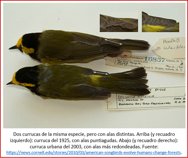 Aparte de estos ejemplos, hay muchas otras condiciones típicas de las ciudades que causan cambios evolutivos en las especies. Por ejemplo, en suelos urbanos contaminados viven lombrices adaptados a vivir en entornos con altas condiciones de compuestos tóxicos. Las aves urbanas modificaron sus alas para moverse con más agilidad entre los edificios y vehículos (ver imagen); cambiaron sus comportamientos (por ejemplo, dejaron de migrar), o aprendieron a competir con otras aves introducidas por los humanos. Estos cambios evolutivos se han dado rápidamente: a veces los cambios han sido hasta el doble de lo que se esperaría en condiciones naturales – tan grande es la presión evolutiva ejercida por la ciudad [xxxiii].