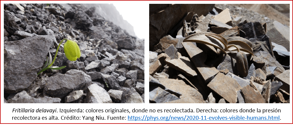 Así como la pesca afecta la evolución de ciertas especies de peces, también hay especies vegetales que están experimentando procesos evolutivos a raíz de la recolección por los humanos. Al inicio de esta entrada ya vimos el caso del loto de la nieve en el Himalaya. Algo parecido le ha pasado a una pequeña planta que vive en montañas de la China, llamada Fritillaria delavayi. Es una planta muy solicitada por los poderes medicinales de sus bulbos, utilizados en la medicina tradicional china; especialmente en los últimos años, se ha recolectado mucho debido a los precios altos de los bulbos. El color normal de la planta es un verde amarillento, que entre las rocas de la montaña se ve desde lejos. Pero, en aquellas zonas donde viene mucha gente para recolectar esta planta, Fritillaria cambió de color: ya no es verde, sino de color más bien marrón, difícil de distinguir entre las rocas en su alrededor (ver imagen). De esta manera, la presión causada por los humanos sobre Fritillaria causó procesos evolutivos que resultaron en un cambio de color en aquellas zonas donde la recolección es más intensa [xxviii].