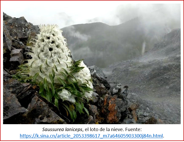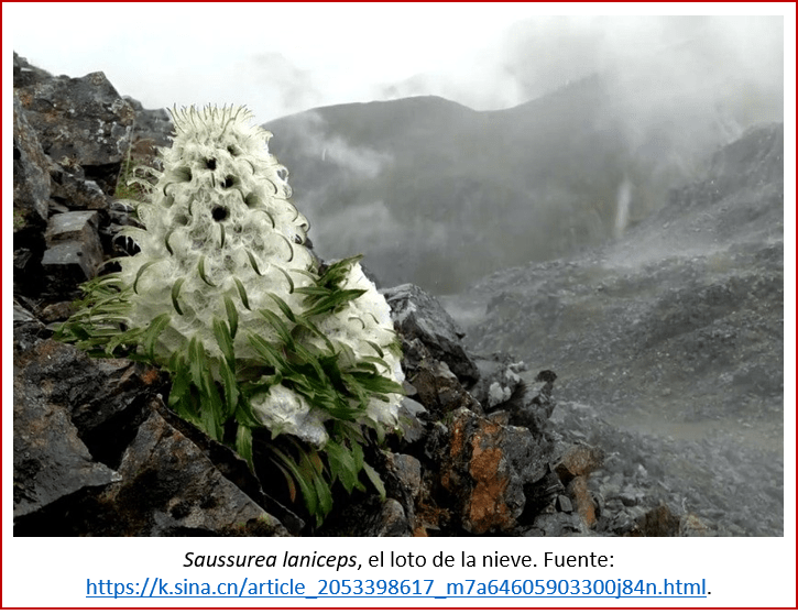En las altas montañas del Himalaya se encuentra una pequeña mata particular: el loto de la nieve. Es considerado medicinal por los chinos y tibetanos [i], y anhelado por los turistas debido al aspecto exótico de su flor. En la realidad se trata de dos especies, ambas llamadas “loto de la nieve”: Saussurea laniceps y Saussurea medusa. Tienen aspectos y propiedades distintas, siendo S. laniceps (ver imagen) la especie preferida, mientras que S. medusa se corta raramente. Los buscadores de S. laniceps prefieren matas grandes por sobre las pequeñas, puesto que se venden mejor, por razones estéticas y por considerarse que las grandes son más eficaces; además, es más fácil encontrar las matas grandes que las pequeñas.
