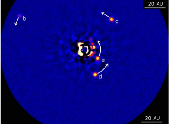 Tal como sabemos todos los que vimos alguna película de la saga de la Guerra de las Galaxias, la mayoría de las estrellas tiene planetas. Según estas películas hay muchos planetas habitados. Pero en la realidad no sabemos si hay vida en algún planeta que no sea nuestra tierra; la estamos buscando, pero hasta la fecha no la hemos encontrado. Sin embargo, pensamos que vamos por buen camino: estamos explorando los planetas de nuestro propio sistema solar, y – tal como vimos en el post anterior – somos capaces de encontrar y estudiar planetas que orbitan otras estrellas. Nos interesan porque, de haber vida en algún lugar en el universo fuera de nuestra tierra, los planetas de otras estrellas son un lugar lógico para buscarla. Estos exoplanetas no suelen venir solos: son comunes las estrellas con más de un planeta. Tal como nuestro sol, muchas estrellas cuentan con un sistema planetario; por encima de estas líneas se muestra uno de estos sistemas (el de la estrella HR 8799[i]). Hablemos en este post de este y otros sistemas planetarios lejanos, y de sus estrellas. Sigue leyendo